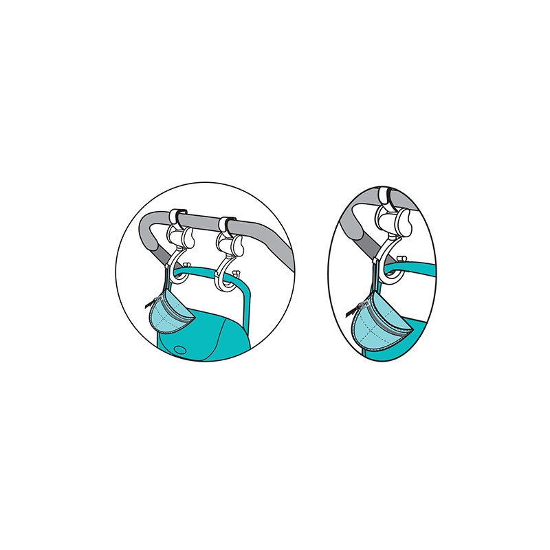 Tiene un práctico y sencillo sistema que se coloca en el cochecito, la cuna, el reposacabezas, del coche para colgar bolsas dejando las manos libres.